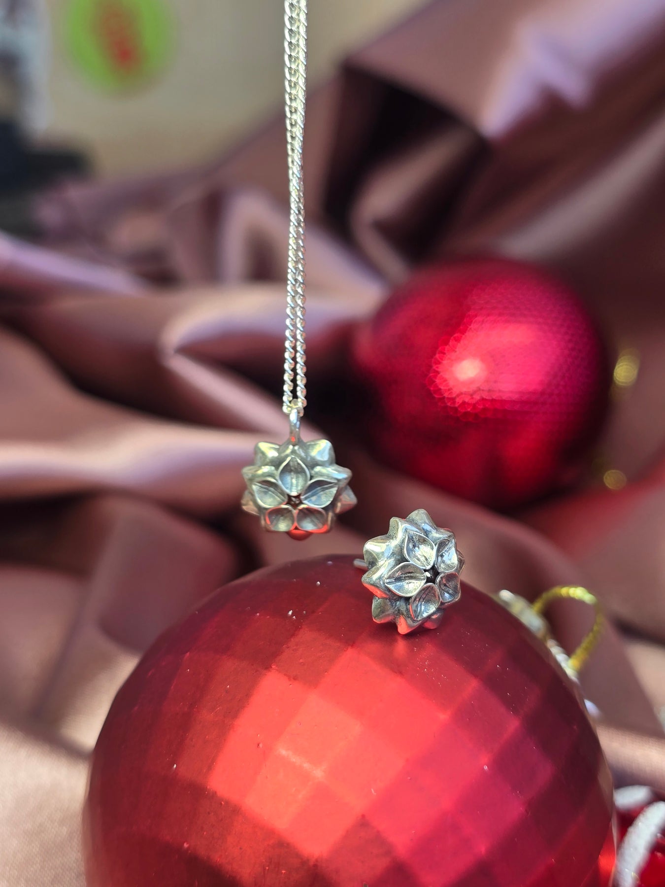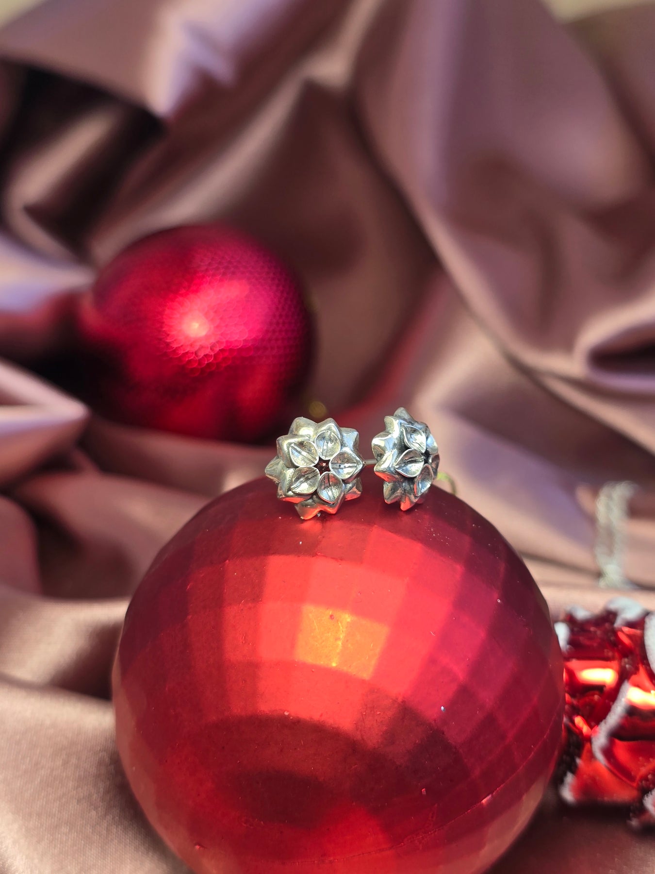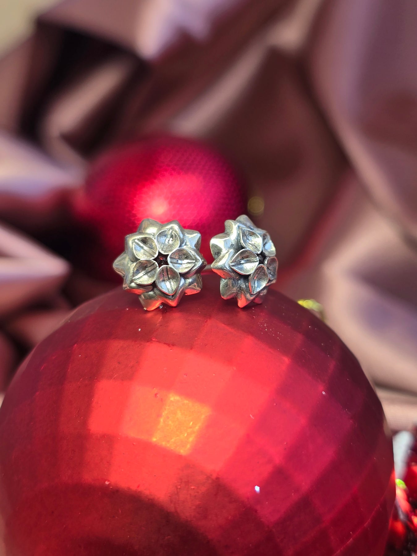 the earrings are delicate and sophisticated, a shiny silver base of inner petals covers a Garnet gemstone that lies on an oxidized set of outer petals.