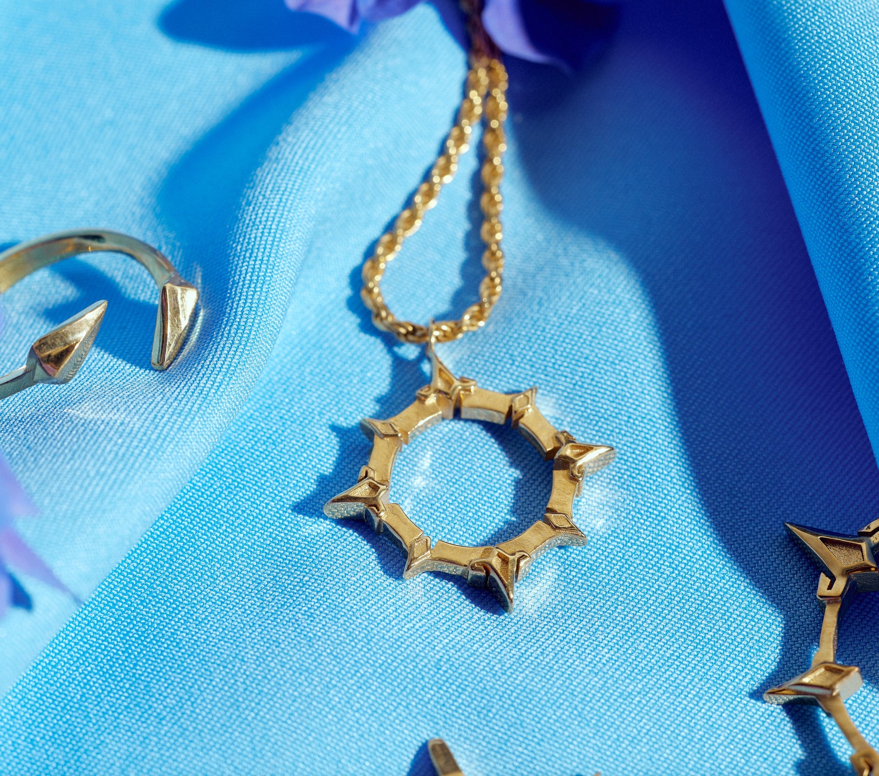 The pendant features a sun-like halo with small rhombuses, combining geometric shapes with a round composition. It's decent in weight and is overall elegant looking and can match many different occasions.